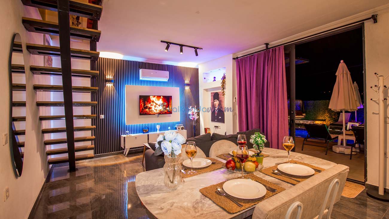 Muhteşem doğa manzarasının kalbinde yer alan villamız, 2+1 oda olup, geniş cam kapıları sayesinde misafirlerimize doğanın büyüsünü her an deneyimleme imkânı sunmaktadır.