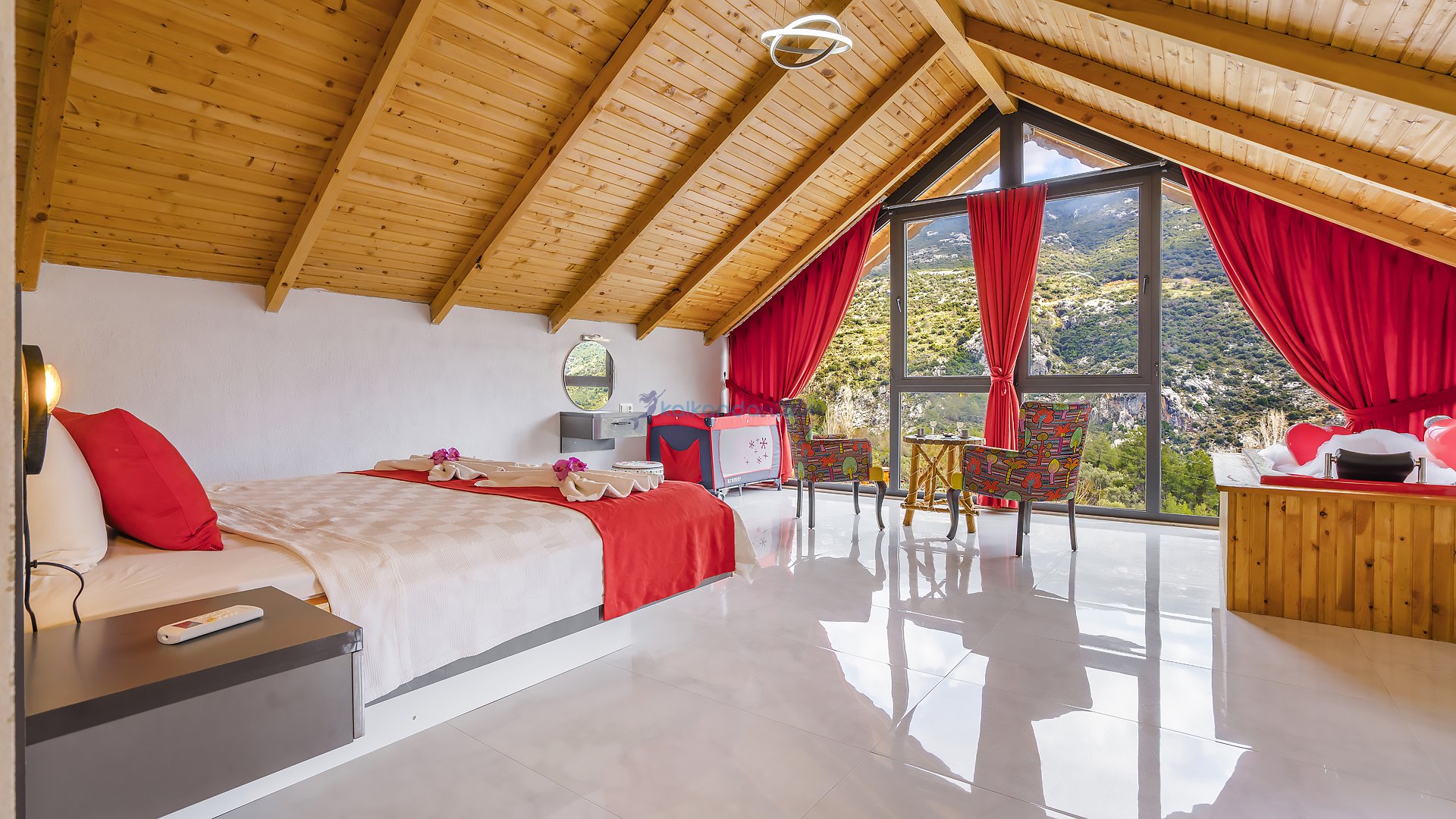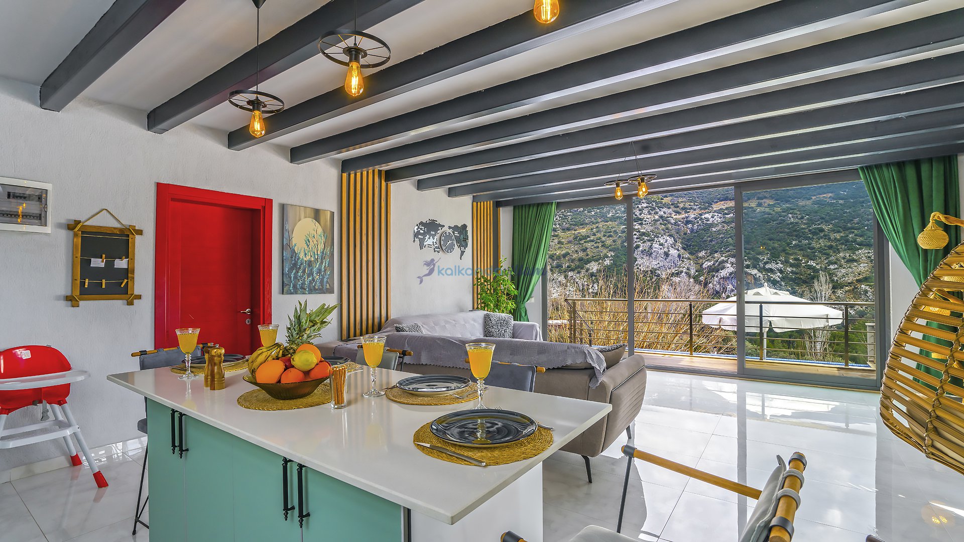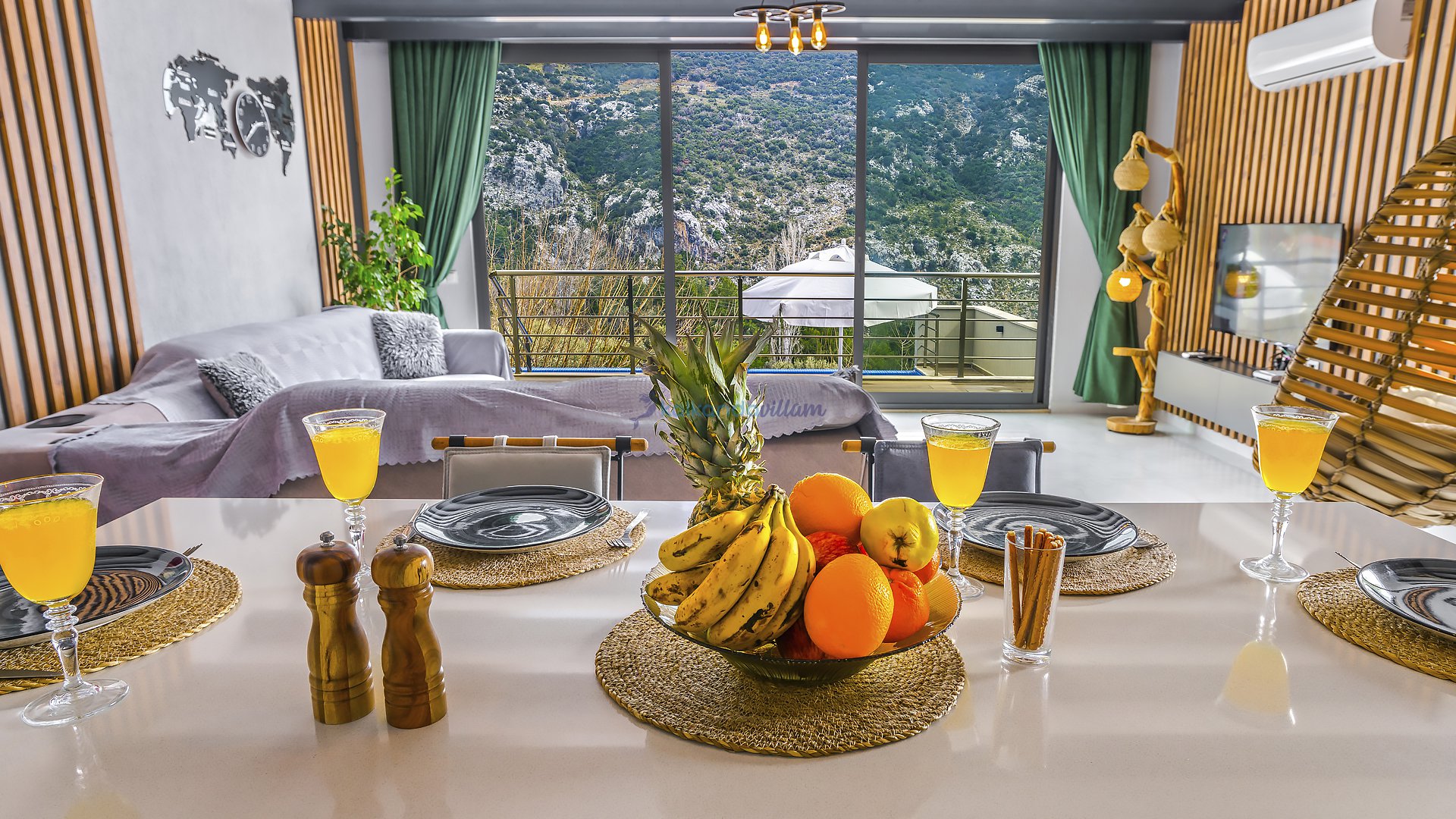 Muhteşem doğa manzarasının kalbinde yer alan villamız, 2+1 oda olup, geniş cam kapıları sayesinde misafirlerimize doğanın büyüsünü her an deneyimleme imkânı sunmaktadır.