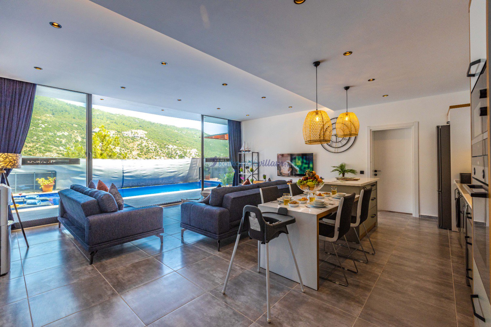 Muhteşem doğa manzarasının kalbinde yer alan villamız, 2+1 oda olup, geniş cam kapıları sayesinde misafirlerimize doğanın büyüsünü her an deneyimleme imkânı sunmaktadır.